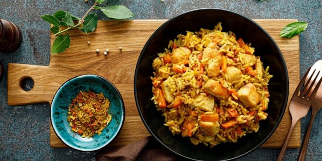 قدمي الأرز البسمني بالكاري والدجاج مع سلطة الزبادي بالخيار.