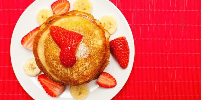 وزعي قطع البان كيك في طبق التقديم وزينيها بشرائح الموز والفراولة وشراب القيقب إن أردت، ثم قدميها.