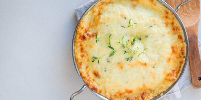 ثم طبقة من صلصة البشاميل، بعدها طبقة اخرى من البطاطا ثم البشاميل.