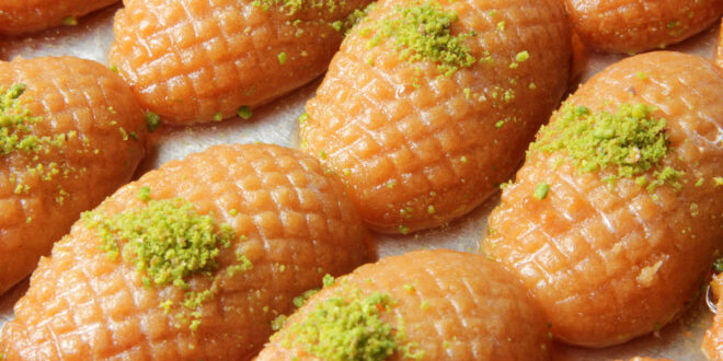 7- اخرجيها من المقلاة وضعيها على صينية ثم صبّي فوقها القطر لتتشربه قبل أن تبرد وتصبح جاهزة للتقديم.