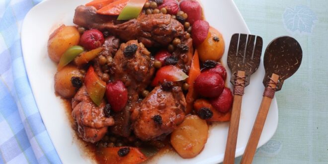 قدمي الدجاج بالبصل والزبيب مع الأرز الأبيض.