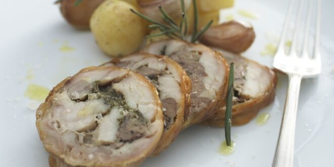قدمي رولات الدجاج المحشوة بالفطر والجبن مع الصلصة والبطاطس والثوم المحمص.