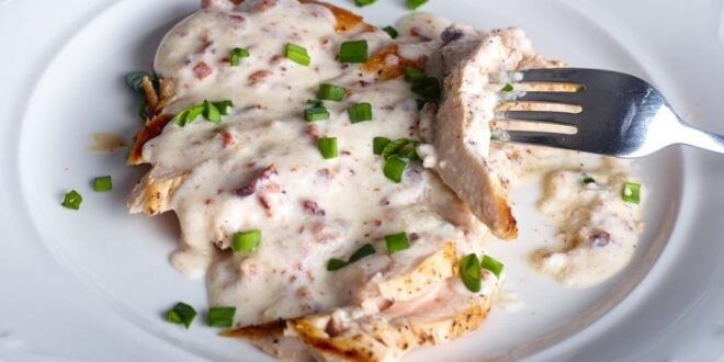 ثم ضعي الدجاج في طبق التقديم، وصبي فوقه الكريمة البيضاء، وزينيها بالقليل من الكزبرة المفرومة أو البصل الأخضر أو البقدونس المفروم.