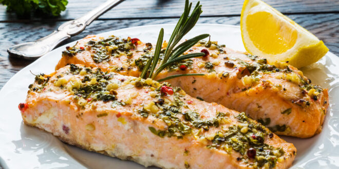 اتركيها على النار حتى تغلي تماماً، ثم صبّيها فوق شرائح السلمون في صينية متوسطة الحجم.