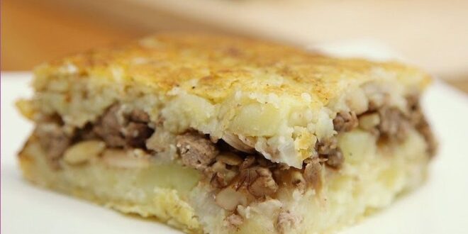 في صينية مستديرة مدهونة بالقليل من الزبدة ومغمورة بالكعك المطحون، وزّعي القسم الاول من عجينة البطاطا واجعليها متساوية، ثم ضعي طبقة من الحشوة التي اعددتها، وغطيها بما تبقى من عجينة البطاطا.
