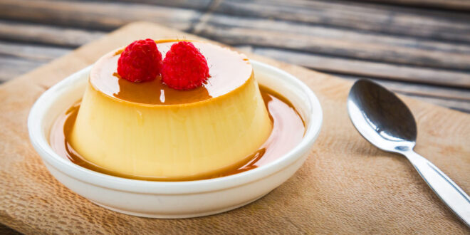 8- في الاكواب المخصصة للكريم كراميل، صبّي الخليط وضعيه في صينية كبيرة الحجم.