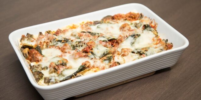 في صينية بيركس، ضعي طبقة أولى من اللازانيا، وفوقها طبقة من الباذنجان، ثم طبقة من البصل ومن ثم طبقة اخيرة من اللازانيا.