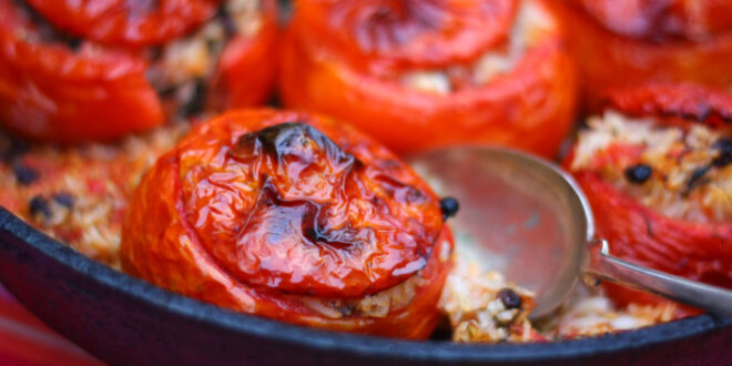 في داخل كل حبة من حبات الطماطم ضعي القليل من هذه الحشوة، ثم صفيها في صينية متوسطة الحجم، وضعي اعلاها الجزء المقطوع سابقاً، واغمريها بالماء حتى النصف.