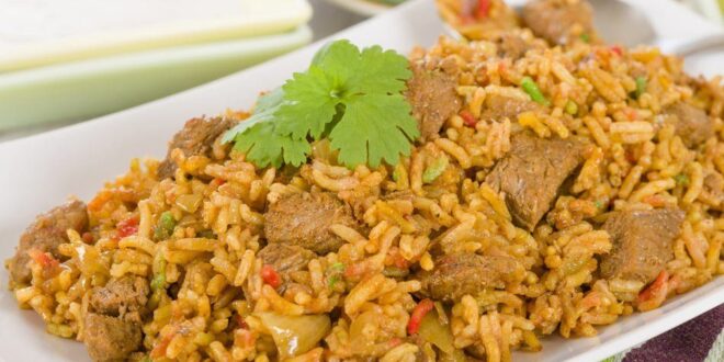 بعد الانتهاء، ارفعي القدرين عن النار وصبي الأرز في طبق التقديم وأضيفي اليه اللحم وقلبيه جيداً، ثم قدميه ساخناً.
